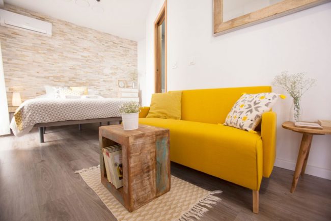Alegre, luminoso y acogedor, en blanco y mostaza. Segunda planta, Exterior. Con dos pequeños balcones.